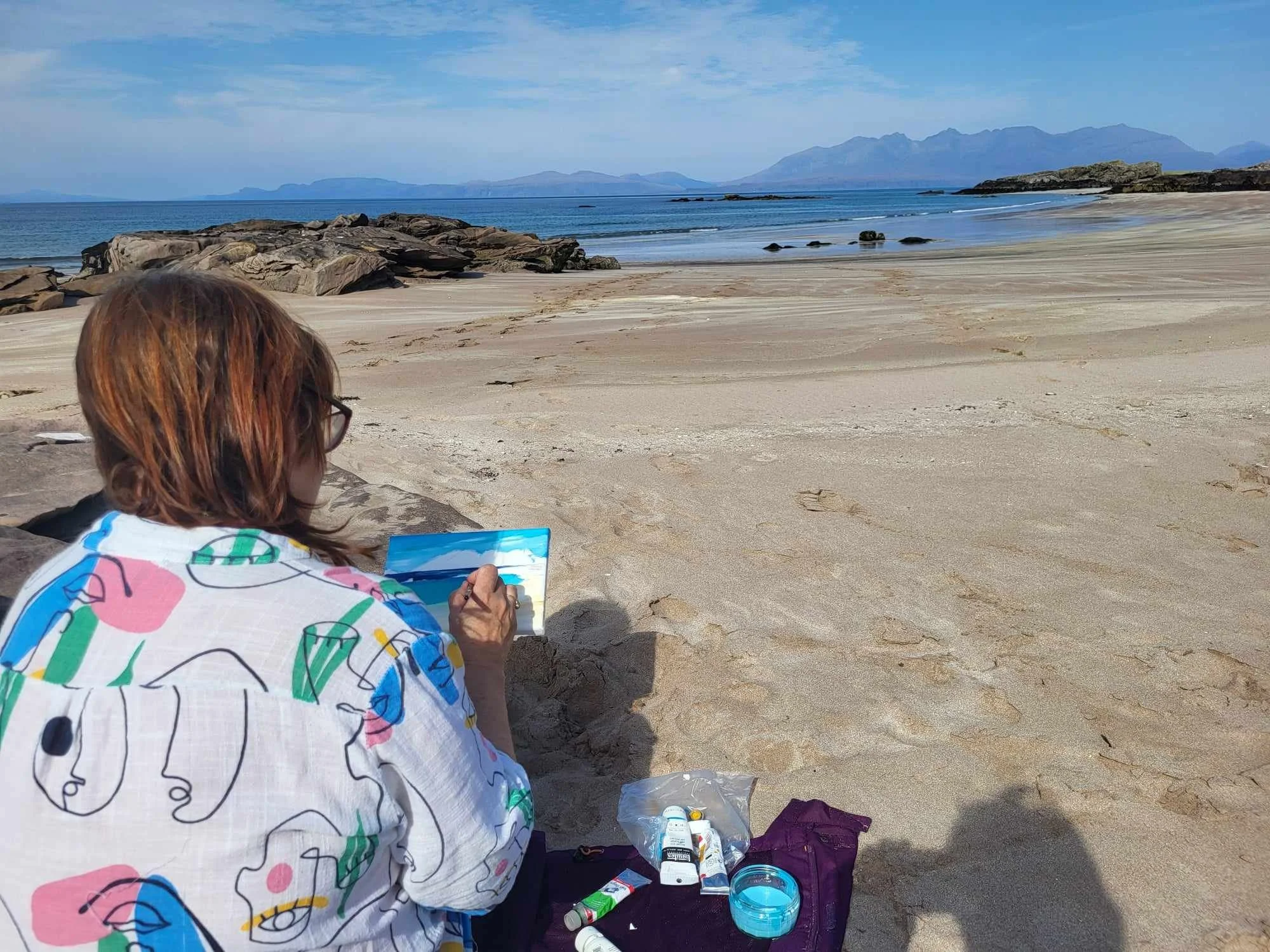 I just love the waves crashing against the rocks and when the sea meets the sand on our stunning beaches. I have a slightly abstract approach mostly in water colour when painting landscapes of the Scottish Borders to bring out the vibrant colours and contours of the rolling hills. My aim is to share what I see in that exact moment, for you to get lost in my art as if you are actually there. When travelling , I enjoy taking in the culture, the music and the Scottish cuisine.
