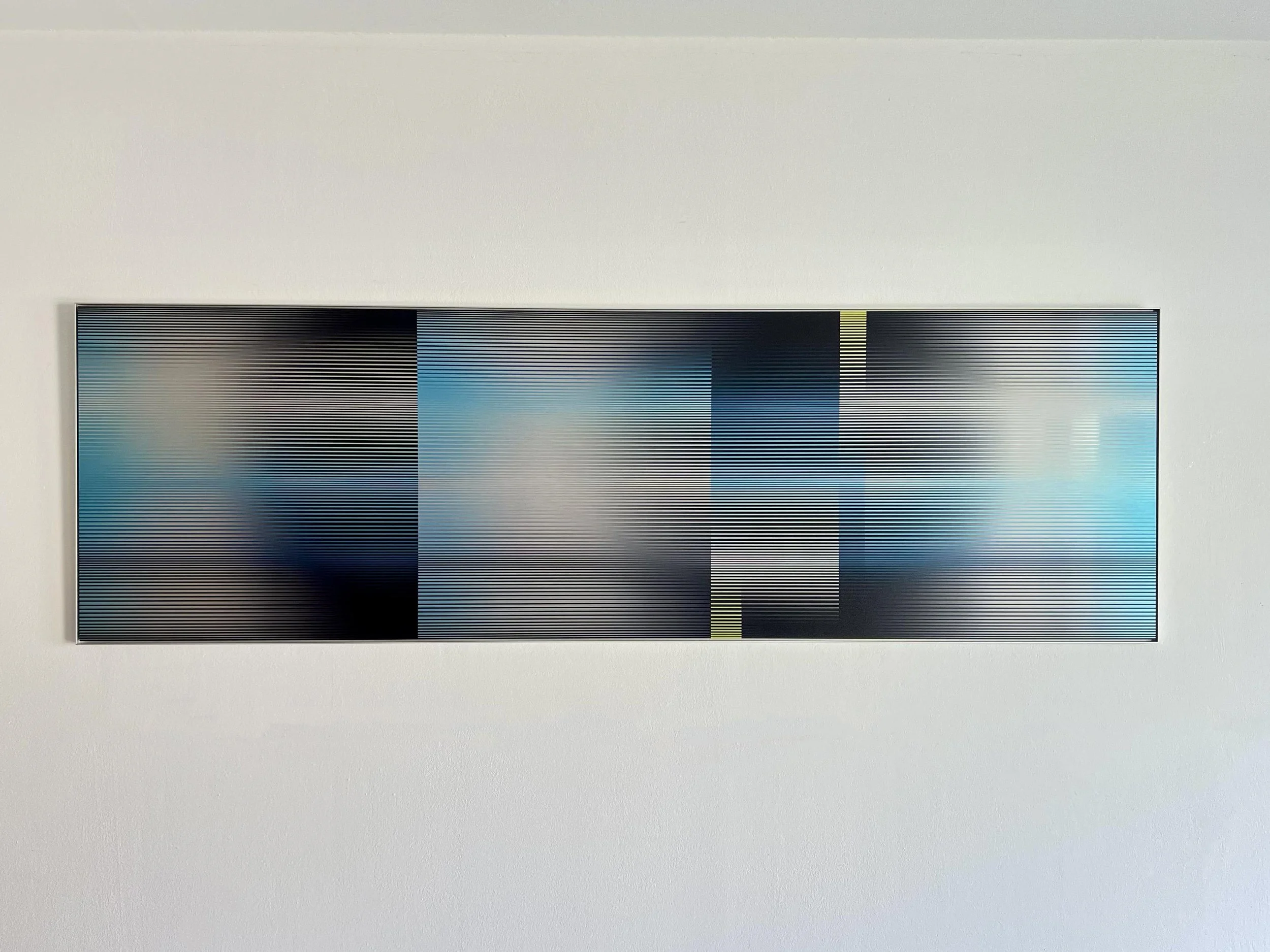 Dahra explores the interplay of colour, light and form through digitally printed, brushed aluminium artworks. Inspired by colour and line within Scotland's landscapes, each piece balances strength with delicacy, transforming the industrial material into vibrant, reflective surfaces that shift with perspective, inviting viewers into an ever-changing experience.