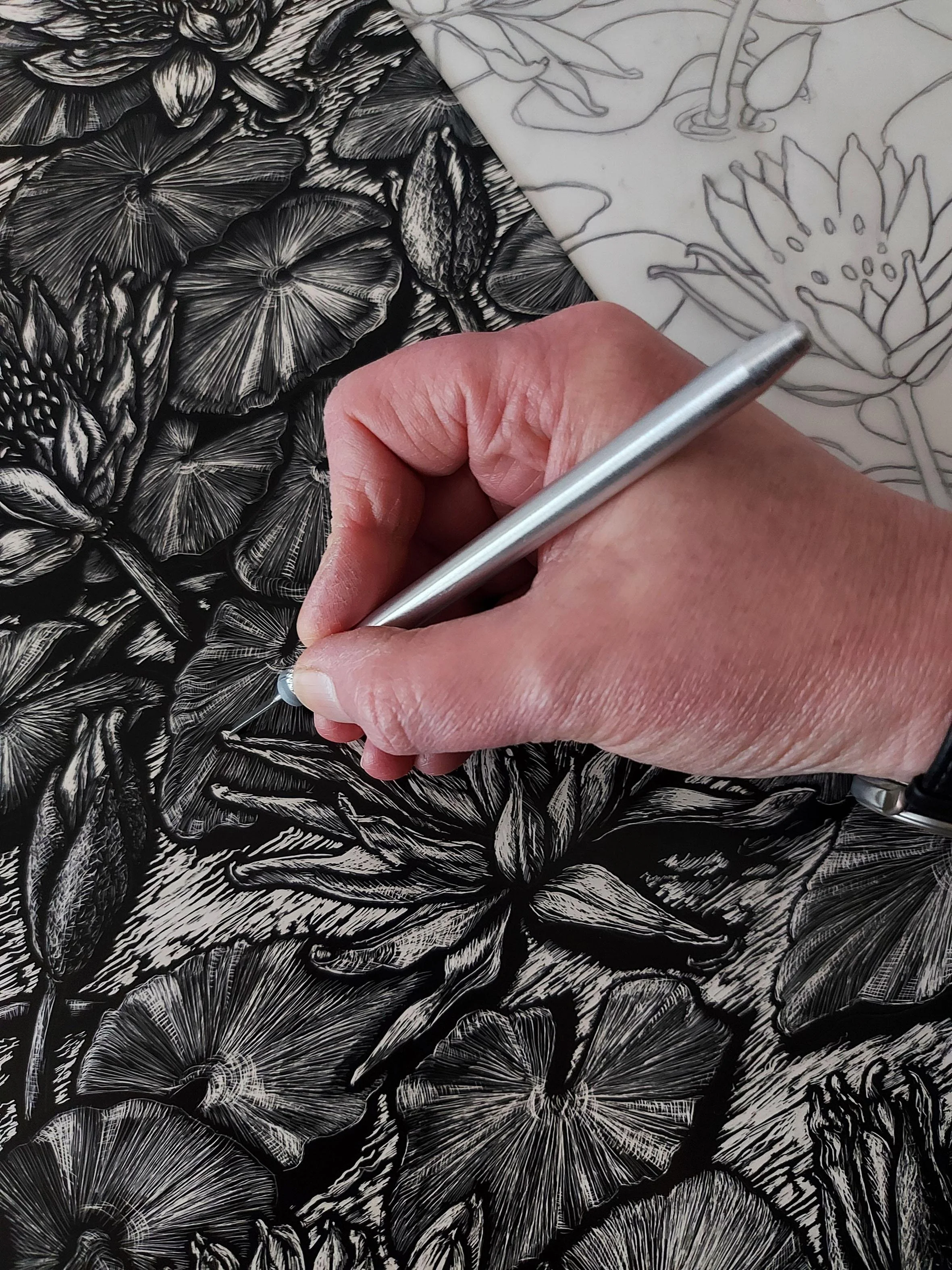 My garden is one of my biggest inspirations and I enjoy the process of selecting specimens I have cultivated, sketching them, developing the design on the scraperboard, and capturing the colours that epitomise the essence of the specimen. The chosen plants are often just past their prime when the blooms exhibit more expressive shapes and forms as they transition towards decline. Additionally, exotic and colourful birds are a preferred subject matter; my proximity to a bird centre dedicated to breeding and conserving rare species from around the globe provides ample opportunity for observation and inspiration. I also love to capture the beauty of the pheasants which roam the garden in winter and spring and they have inspired a couple of recent works. Situated in Birgham, I work from my garden studio, which offers the added benefit of stepping outside to select items for my drawings. The challenge sometimes lies in making this decision without being distracted by gardening activities.